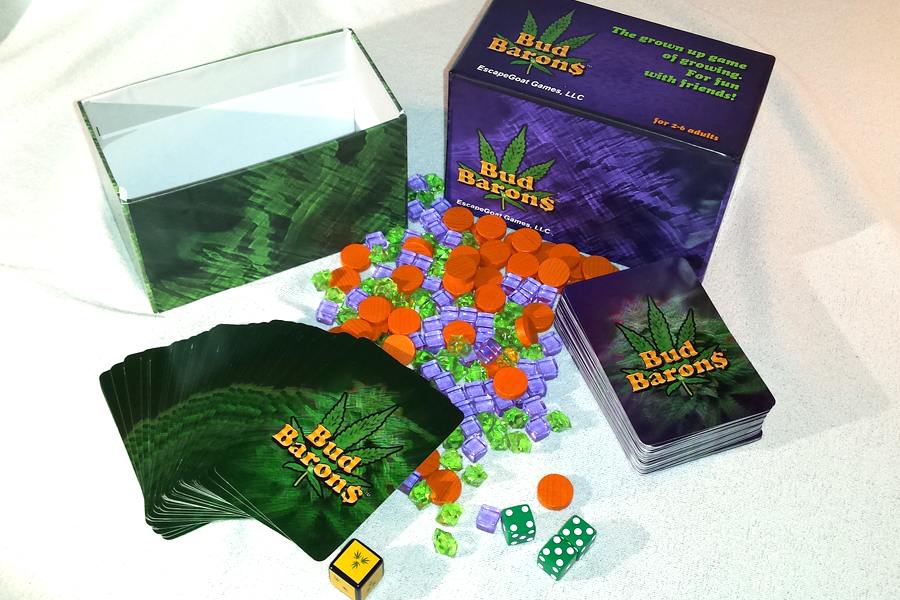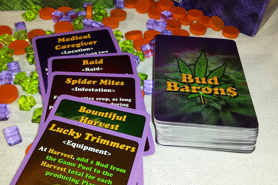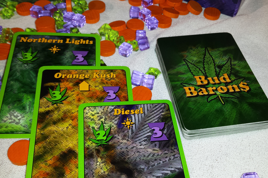 Harvesting: When playing a Harvest Card, the Player is able to take a number of Buds off their own Plants equal to the amount designated/rolled on the particular Harvest Card played. Those Buds can then be changed for Coins, at the rate indicated by rolling the Transfer Rate Die. The Player must sell for at least one Coin, and will always be able to get at least one Coin (even if the Harvest doesn’t get any/enough Buds) from trading Buds for Coins at this rate. 2 Buds per Coin is the best rate, so a common strategy is to save all the Buds one can until the next chance to roll a better rate.